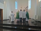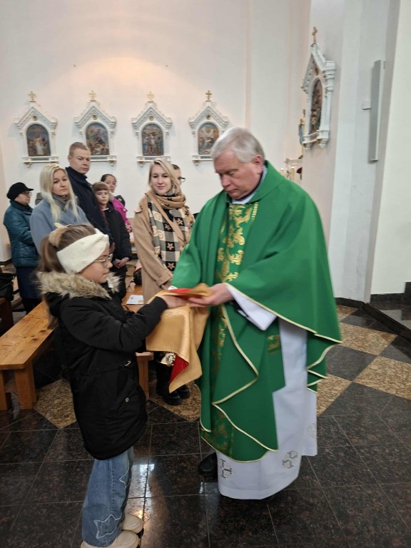Per aukojimą, katechezės vaikučiai palydimi gerbiamo parapijos katecheto Egidijaus Tatarūno, prie altoriaus atnešė ostiją ir vyną.