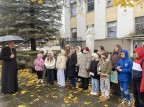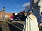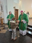 Atvykusį vyskupą prie bažnyčios pasitiko katechezės vaikučiai su juos lydinčiu katechetu Egidijumi Tatarūnu.